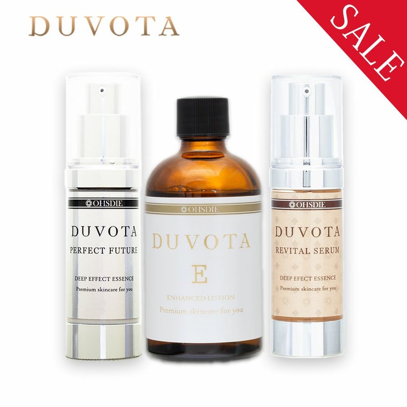 フラーレン化粧水「ドゥボータEローション」とEGF美容液「ドゥボータ・リバイタルセラム」、ヒト幹細胞培養液クリーム「ドゥボータ・パーフェクトフューチャー」がセットになった、DUVOTAスキンケアの集大成となるセットです。主要な美容成分はすべて実感レベルで高配合しています。