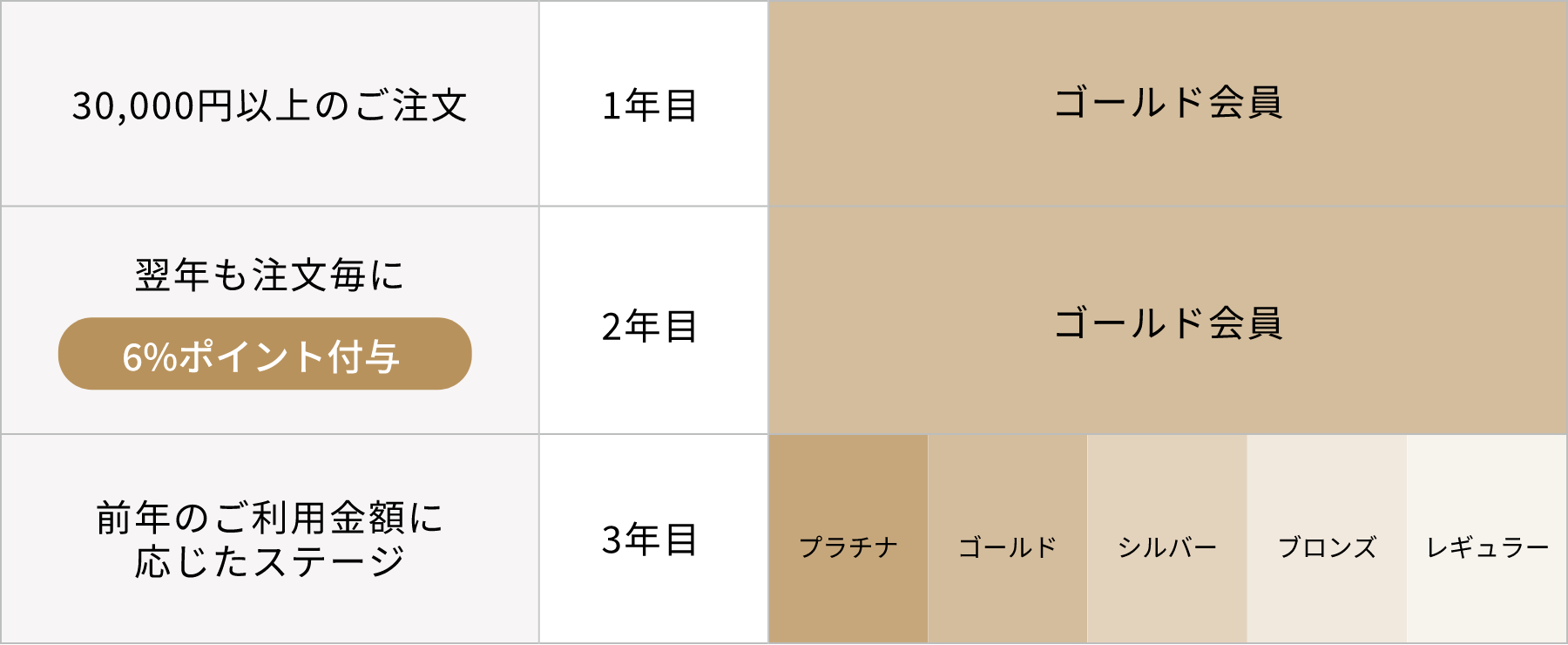 1年間のご注文金額が一定金額を超えると会員ランクが上がり、ポイント付与率など特典内容がグレードアップします。